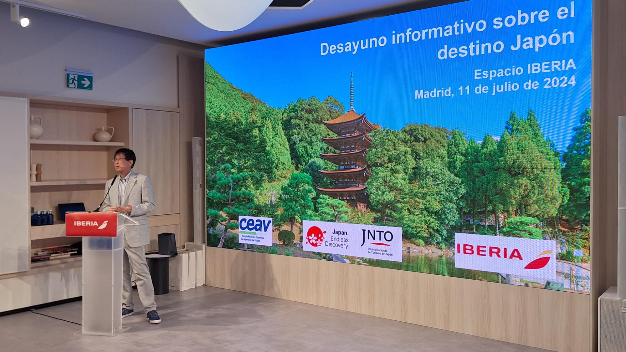 Además, enumeró las acciones de colaboración que JNTO tiene planificadas para promocionar la Exposición Universal Expo Osaka 2025. Después, María José Eiras, key account manager de Iberia y Kanami Murakami, representante comercial de Japan Airlines, informaron a los asistentes acerca del acuerdo de negocio conjunto que llevan desarrollando desde años atrás entre British Airways, Finnair, Iberia y Japan Airlines para trabajar como si fueran una única compañía aérea en las rutas entre Europa y Japón, lo que incrementa las posibilidades de viajes para los turistas.