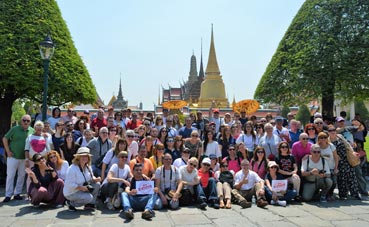 Pasearon por las bulliciosas y coloridas calles de la capital, donde degustaron la particular gastronomía tailandesa, visitaron el templo del Wat Pho, que aloja el inmenso Buda Reclinado —la estatua de Buda más grande de Tailandia, de seis metros de largo y 15 de altura—, y posteriormente se desplazaron hasta Damnoen Saduak para conocer el sorprendente Mercado Flotante. No menos inolvidables fueron las vistas nocturnas de Bangkok que contemplaron desde el Restaurante Cielo, así como el obligatorio recorrido en tuk-tuks, los simpáticos taxis de tres ruedas, por el centro de la ciudad.
