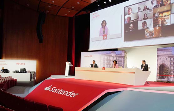 Banco Santander es una entidad muy avanzada en el sistema de comunicación telemática con sus accionistas. Teniendo ya la convocatoria de su junta general formalizada cuando se decretó el estado de confinamiento, decidió mantener la fecha de celebración de su Junta el día 3 de abril del presente año. Por las restricciones de movilidad se decidió cambiar la ciudad de celebración de Santander a Boadilla del Monte (sede corporativa del Banco en Madrid).