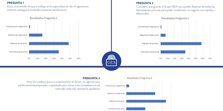 Ante la pregunta relacionada con las herramientas que Grupo GEA brinda a las asociadas, más del 90% de las participantes se encuentran bastante o totalmente de acuerdo con que el Grupo les proporciona los servicios necesarios para modernizar su empresa con rapidez y efectividad. Esto es una respuesta que nos genera gran satisfacción, ya que refleja el trabajo que hemos llevado a cabo en este sentido, en el de aportar soluciones que permitan el cambio y la adaptación a las continuas transformaciones que sufre el mercado. Por ejemplo, con la alianza con Ofimática y el nuevo CRM que ofrecemos a nuestras agencias o proyectos como la puesta en marcha de GEA TRAVEL MEDIA, dice Fernández.