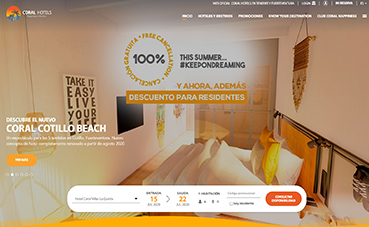 La nueva página web de Coral Hotels es más intuitiva y funcional y cuenta con un diseño moderno, fresco y minimalista, acorde a la imagen y personalidad de la marca. Una de las funcionalidades que más destaca es su nuevo motor de búsqueda, que permite al cliente filtrar los resultados según el destino o la experiencia turística que más le convenga: Adults Only, Coral Families, Nature&Adventure o Exclusive Experience. Otro de sus valores diferenciales es que cada uno de los establecimientos cuenta ahora con una sección que destaca su valor más característico: una completa guía de la naturaleza que rodea a Coral Los Silos, una recopilación de las playas más espectaculares de El Cotillo o una página dedicada al Cycling Center de Coral Teide Mar, que incluye sus propias rutas ciclistas, entre otros ejemplos.