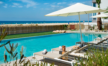 En la terraza, la experiencia de relajarse junto al mar se consigue con la selección de pavimentos discontinuos y del mobiliario de exterior y accesorios en materiales naturales. Las plantas autóctonas dan el toque de sosiego y naturalidad al conjunto y son muestra del respeto por el enclave privilegiado en el que se encuentra el hotel, las dunas de Castelldefels, espacio protegido por su valor natural.