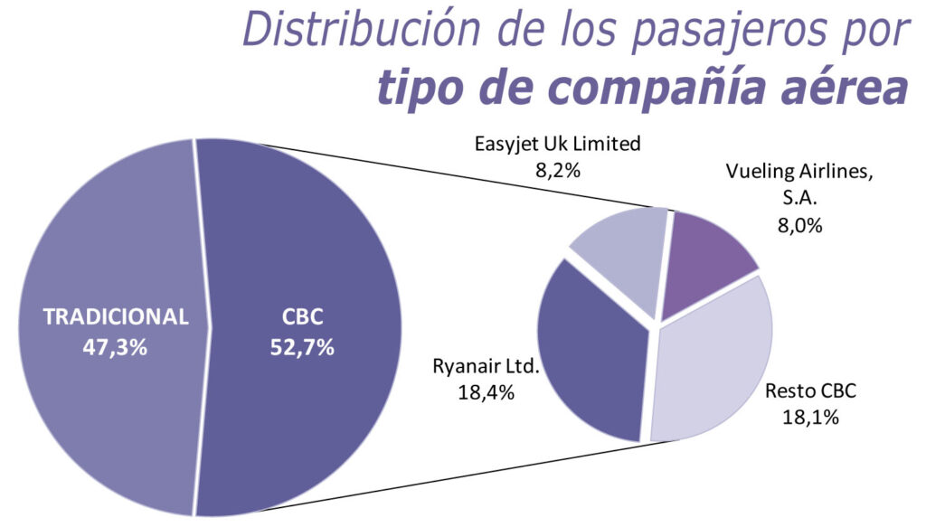 Ryanair, EasyJet y Vueling se mantienen como las tres líneas aéreas de ‘bajo coste’ de referencia con una cuota del 34,6% del total del flujo aéreo y del 65,6% en el caso concreto de esta modalidad. Un mes más, EasyJet y Vueling muestran un comportamiento positivo. En cambio, Ryanair rompe con la tendencia que venía experimentando en meses anteriores y sufre un retroceso interanual.