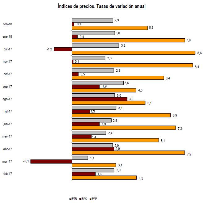 El Índice de Precios de Apartamentos Turísticos (Ipap) ha aumentado un 5,3% respecto a febrero de 2017. La tarifa turoperadores y agencias de viajes, que tiene el mayor peso en la estructura de ponderaciones este mes (61%), ha subido un 6,7%. El Índice de Precios de Campings (Ipac) se ha incrementado un 0,1% en tasa anual. La tarifa bungalow, que ha tenido el mayor peso en la estructura de ponderaciones en febrero (37,5%), ha bajado un 1,8% respecto al mismo mes de 2017. El Índice de Precios de Alojamientos de Turismo Rural (Iptr) ha registrado un aumento del 2,9% en febrero. La tarifa fin de semana, que ha supuesto el 72,5% del peso total, ha subido un 3% en tasa anual.