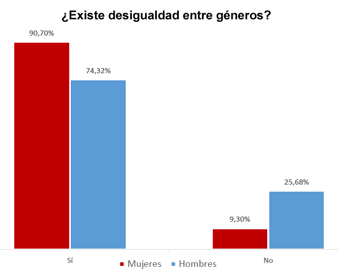 Según el informe, tanto hombres como mujeres son conscientes de la existencia de desigualdad entre géneros, con porcentajes del 74% y del 90%, respectivamente. Además, el 84% de las mujeres y el 68% de los hombres creen que ambos géneros no reciben las mismas oportunidades profesionales.