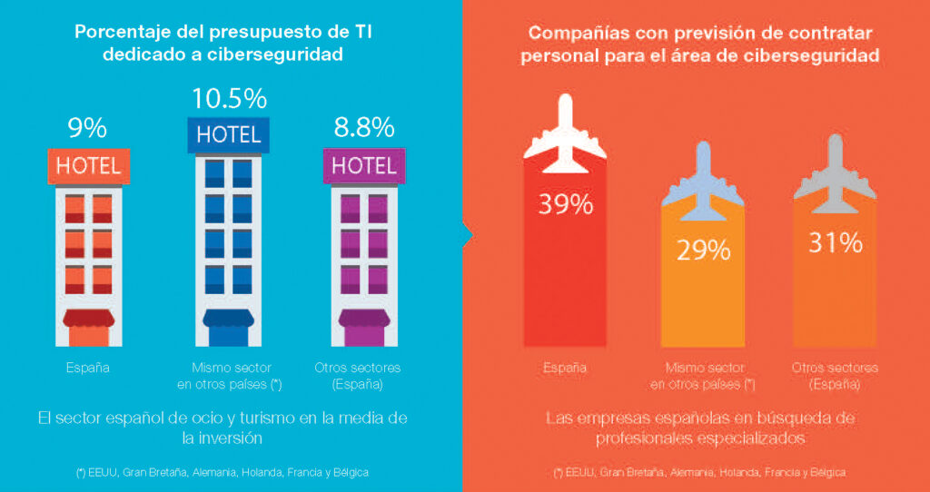 Las empresas españolas de Turismo y ocio dedican un 9% de su presupuesto anual de tecnología de la información (TI) a la ciberseguridad. Se trata de un porcentaje similar al que destinan las empresas de otros sectores, en cuyo caso la media es del 8,8%. En el resto de países analizados (Estados Unidos, Gran Bretaña, Alemania, Holanda, Francia y Bélgica), el presupuesto de las empresas del Sector Turístico se eleva hasta el 10,5%.