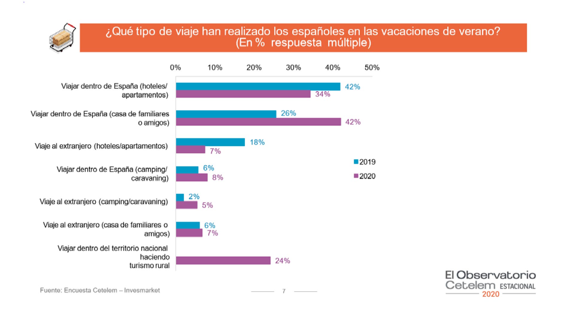Este notable descenso en el gasto se debe principalmente a que el 42% de los españoles encuestados se ha alojado en casa de familiares o amigos, un 19% más. Esto ha supuesto una reducción de ocho puntos en el porcentaje de españoles que ha declarado haberse alojado en hoteles y apartamentos, al igual que en los viajes al extranjero, que también se han visto reducidos, pasando de un 18% en 2019 a un 7% en 2020. Esta situación ha beneficiado considerablemente al fenómeno caravaning, ya que un 8% de los sondeados han pasado sus vacaciones viajando por España en este tipo de vehículos, frente al 6% del 2019.