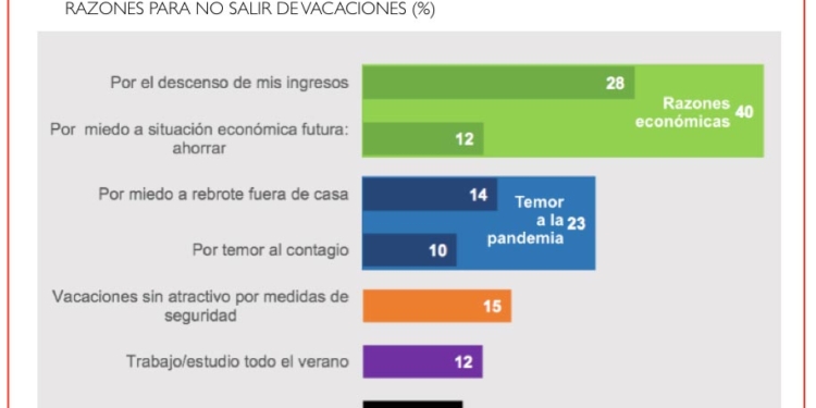 En el apartado económico, un 28% lo justifica por la caída de sus ingresos y otro 12% lo hace por ahorro, ante la posibilidad de una evolución negativa de su situación personal, sobre todo en el plano laboral. El temor a la pandemia, asunto que en 2020 era la razón primera para no viaja, también hace mella en la presente campaña de verano, ya que afecta a la decisión de un 25% a causa de la crisis sanitaria, bien por miedo a los rebrotes fuera de casa (14%) o a los contagios (10%).
