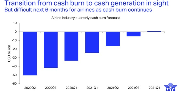 La aviación irá paliando la quema de efectivo conforme vaya pasando este 2021. Según los últimos datos de la Asociación de Transporte Aéreo Internacional (IATA), durante este primer trimestre las pérdidas de ingresos serán entre un 20%-30% mayores que en el mismo periodo del año pasado, mientras que en el segundo ya no llegarán ni al 20%. Las previsiones para el tercer y el cuarto trimestre dejan un gran optimismo para el sector aéreo, ya que las pérdidas podrían ser muy escasas, e incluso durante los últimos tres meses del año se podría registrar unos datos de efectivo positivos tras más de un año y medio de desplomes. No obstante, todas estas previsiones siguen sujetas a la evolución de la pandemia y sobre todo a que se administren las dosis de vacunas de manera ágil y eficiente.