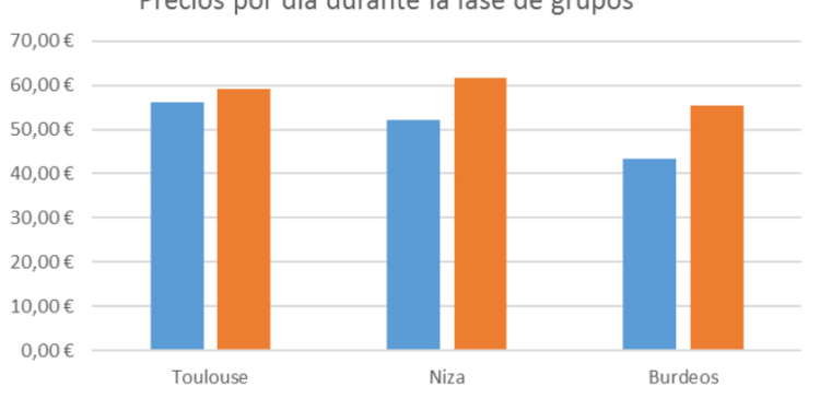 De las ciudades en las que la selección española disputará la fase de grupos, Burdeos es de media la más barata para alquilar un vehículo. El precio medio es de 49,3 euros. Le sigue Niza con 56,9 euros y, por último, Toulouse con 57,6 euros.