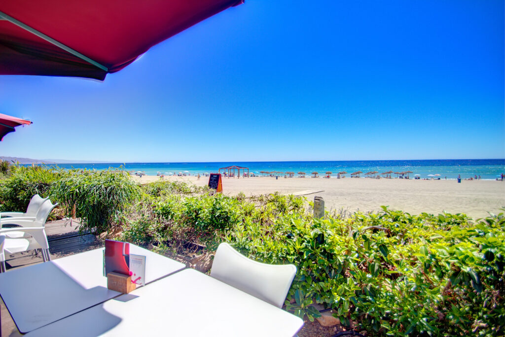 El Chiringuito tiene una capacidad para 200 personas y ofrece una extensa carta de comidas a mediodía, destacando los mejores espetos de la zona en sus distintas variedades, crujiente de pulpo, gulas con huevo, y diversas especialidades de carnes a la brasa.
