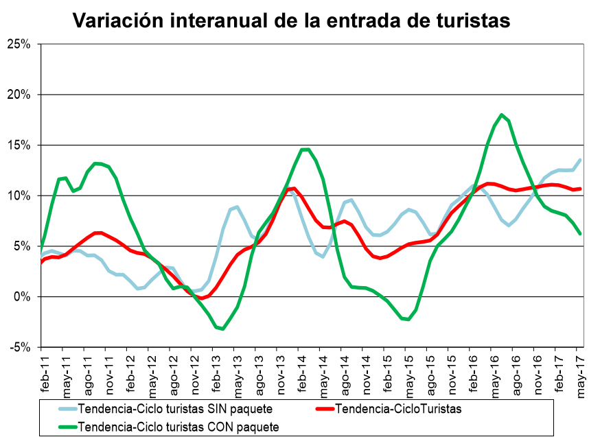 Observada la curva tendencial de los turistas que han visitado España con viaje organizado desde 2011, esta revela que se han producido elevados incrementos interanuales en periodos concretos, siempre coincidiendo con los grandes retrocesos acontecidos en los citados países de la cuenca mediterránea, como consecuencia de la inestabilidad política o atentados sufridos en los mismos. La última gran subida se registra en el primer semestre de 2016, alcanzándose en julio una tasa positiva del 17%. Desde entonces se viene produciendo una ralentización, que prosigue en los meses de 2017 hasta el último dato disponible de mayo.