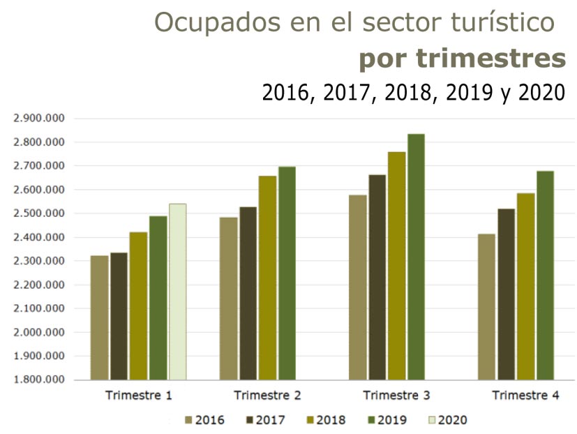 En términos generales, este trimestre la economía española ha generado 210.000 ocupados adicionales respecto al mismo trimestre del año anterior, de los cuales el 24,8% han sido fruto de las actividades vinculadas al Turismo. Asimismo, se ha alcanzado la cifra de 2.540.547 ocupados vinculados a actividades turísticas, lo que significa un aumento interanual del 2,1% y supone 52.059 empleados más que en el mismo trimestre del año anterior. Los ocupados en el Sector han constituido el 12,9% del empleo total en la economía española. En cambio, el porcentaje de parados sobre activos en actividades turísticas fue del 15,1%, cifra superior a la del mismo trimestre del año anterior.