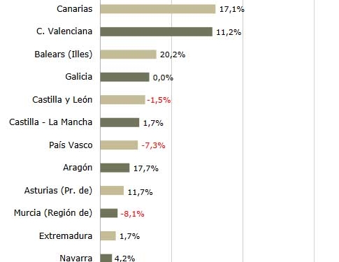 Por Comunidades autónomas, los ocupados en Turismo crecen en 14 de ellas. Solo experimentan retrocesos interanuales Murcia, País Vasco y Castilla y León, con tasas negativas del 8,1%, 7,3% y 1,5%, respectivamente. Todo lo contrario sucede con Madrid, Baleares y Canarias, que protagonizan los mayores incrementos en términos de empleo, con variaciones del 24,1%, 20,2% y 17,1%. En el primer trimestre, en España el 73,9% del empleo turístico está concentrado en las seis Comunidades con más flujos turísticos: Madrid, Cataluña, Andalucía, Comunidad Valenciana, Canarias y Baleares.