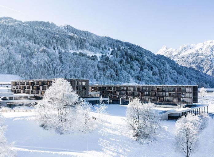 Los arquitectos hacen uso de referencias de la zona: las vallas de ramas tejidas y listones de madera típicos de los graneros locales se referencian como elementos decorativos y como biombos en el restaurante, mientras que las alfombras hechas a mano local se reproducen en papeles pintados a medida utilizados como cabeceros de todas las habitaciones. Los materiales vernáculos como la piedra, la madera de abeto y alerce y el yeso blanco se utilizan para rendir homenaje al estilo de construcción tradicional de la zona, y en particular al Montafoner Häus, una construcción de abeto y piedra que durante siglos ha sido el arquetipo arquitectónico local. Las tejas de madera utilizadas en estos edificios se presentan como motivo decorativo en el área de bienestar y spa.