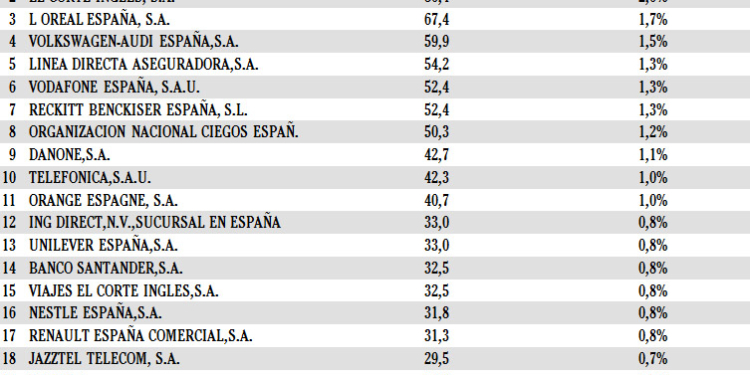 Viajes El Corte Inglés se encuentra en décimo quinto lugar de la tabla, cinco puestos por debajo de la posición que ocupaba en 2013, cuando su inversión ascendió a 39,5 millones de euros. La primera posición es para Procter & Gamble España (99,5 millones), seguida de El Corte Inglés (80,4 millones) y Loreal España (67,4 millones).