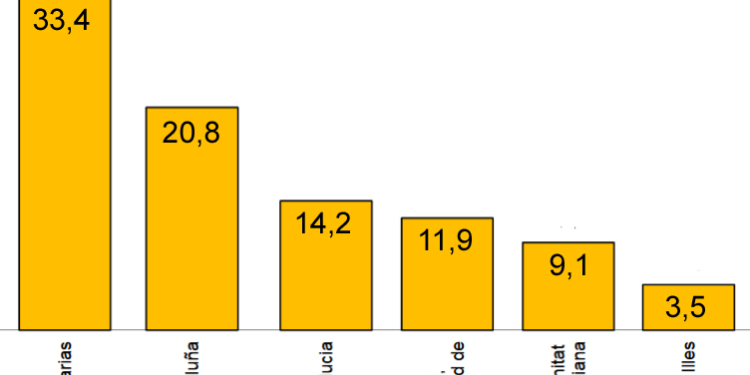 Por Comunidades autónomas de destino, las dos primeras acaparan más de la mitad del gasto efectuado por los turistas internacionales en España. Lidera la tabla Canarias con 2.473 millones de euros, el 33,4% del total y un 1,1% más que en los dos primeros meses de 2015. Por detrás se encuentra Cataluña con 1.545 millones (20,8% del total), un 15,7% más que el año anterior.