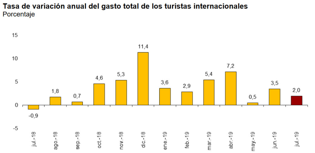 El gasto total de los turistas internacionales que han visitado España en el mes de julio se eleva un 2%. Según los últimos datos del Instituto Nacional de Estadística (INE), asciende a 11.980 millones de euros. El desembolso medio por turista crece un 3,4%, situándose en 1.212 euros, mientras que el diario lo hace un 4,9%, hasta 160 euros.