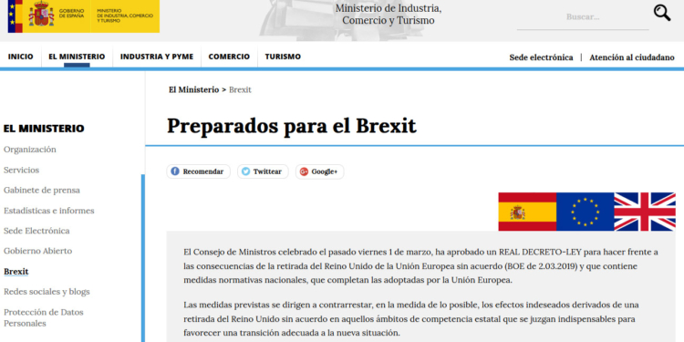 El Ministerio de Industria, Comercio y Turismo pone en funcionamiento la página web ‘Preparados para el Brexit’, que recoge información sobre el proceso de salida de Reino Unido de la Unión Europea en relación con las áreas de competencia del departamento. Alojada en el ‘portal’ del ministerio (www.mincotur.gob.es), proporciona asesoramiento a los ciudadanos europeos y británicos, así como a las empresas y operadores que mantienen relación económica o comercial con Reino Unido.