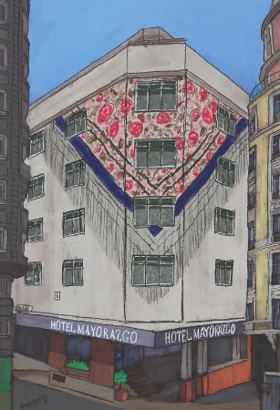 El Hotel Mayorazgo rinde su particular homenaje a la feria, obsequiando a sus clientes con una creación exclusiva para el Hotel Mayorazgo del artista Bobby Q que evoca uno de sus elementos más representativos, su fachada engalanada con un mantón de Manila.