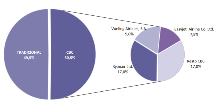 En función de las aerolíneas, Ryanair, Easyjet y Vueling repiten cada mes como las más utilizadas. Entre las tres suelen acaparar más del 30% del total del flujo aéreo de pasajeros internacionales y en torno a dos terceras partes del tráfico low cost. Además, habitualmente protagonizan notables incrementos interanuales.
