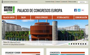 El menú central de la nueva página web del Palacio Europa se estructura en cinco pestañas. Las dos primeras hacen referencia a la faceta verde de esta infraestructura y los diferentes tipos de salas que ofrece (auditorios, salas de conferencias, espacios polivalentes y salas de apoyo). Una tercera pestaña recoge información sobre otros equipamientos de la ciudad para realización de congresos y eventos como los palacios Villa Suso y Escoriaza Esquivel, así como otros espacios singulares de la ciudad como museos y hoteles. En una cuarta pestaña se presentan actividades e incentivos que Vitoria-Gasteiz ofrece para congresistas y expositores, además de datos prácticos, una relación de alojamientos y otros aspectos de interés turístico. Por último, una quinta pestaña sobre comunicación recoge toda la actividad de prensa relacionada con el Palacio Europa además de una galería de imágenes, vídeos y el recorrido virtual.