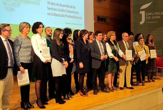 El presidente de la Diputación Provincial de Jaén, Francisco Reyes, acompañado por las diputadas de Igualdad y Bienestar Social, María Eugenia Valdivielso, de Igualdad, Francisca Medina, y de Juventud, María de los Ángeles Leiva, ha participado en este encuentro que ha puesto de relieve la importante labor que desarrolla el personal de los mismos, desde los que se atienden a más de 53.000 personas de los municipios menores de 20.000 habitantes.