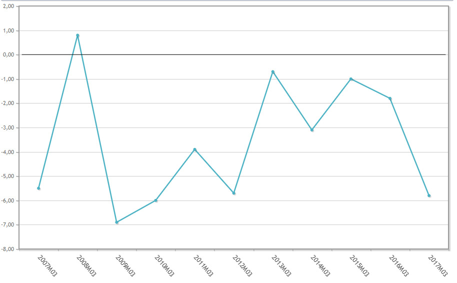 La evolución de los precios en este arranque de 2017 dista mucho de la registrada en los tres primeros meses de los dos años anteriores. En 2015 experimentaron una tímida bajada del 1%, mientras que en 2016 fue del 1,8%. En el periodo comprendido entre 2007 y 2017, tan solo en el primer trimestre de 2008 subieron. Lo hicieron un 0,8%.