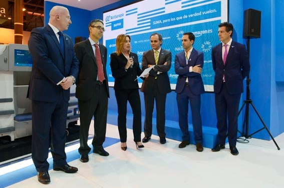 La directora general de Air Europa, María José Hidalgo, acompañada del director general de NH Hotel Group para España, Portugal y Andorra, Hugo Rovira; el director general de Europcar, José María González; el director de general de Halcón Viajes, José María Hoyos; el director comercial de Cepsa, Alvaro Díaz; y Borja Bartolomé-Carrion, Senior Business Development Manager Europe de Amazon; las empresas asociadas que participan, junto a Be Live, en este nuevo programa de pasajero frecuente; ha dado a conocer las principales ventajas de Suma cuyo principal objetivo es mejorar la experiencia del cliente y agradecer la confianza depositada en la aerolínea.