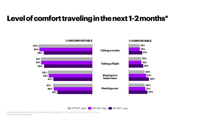 Y es que, según uno de los estudios de Accenture, pese a que los datos han mejorado con el paso de los meses, el 43% de los consumidores sigue siendo cauteloso a la hora de reanudar sus actividades normales. El 17% que afirma estar viviendo el momento y al 28% que está ansioso por volver a cómo eran las cosas antes. De igual manera, el 58% tiene miedo todavía a viajar en cruceros y en avión; el 48% también se muestra precavido a la hora de alojarse en un hotel, y el 42% a alquilar un coche. Además, el estudio espera que el uso de canales digitales aumente en más del 10% según se vaya aliviando la pandemia.