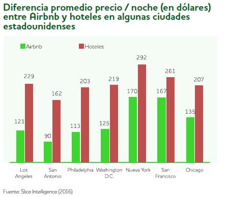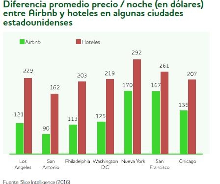 Por ejemplo, en las principales ciudades turísticas estadounidenses las viviendas ofertadas a través de Airbnb son entre un 35% y un 47% más baratas que el promedio de las habitaciones ofertadas por los hoteles de estas ciudades. En la actualidad, el número de pisos ofertados a través de Airbnb se incrementa mes a mes. Su valoración de mercado convierte a esta plataforma en la segunda tras Uber y por encima de compañías tradicionales del Sector Hotelero como Marriott.