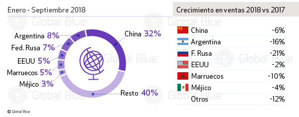 El mayor desplome corresponde a Rusia, cuya economía se ha visto claramente perjudicada por las sanciones impuestas por el Gobierno de Estados Unidos, según revela Global Blue. El desembolso en compras tax free de estos visitantes retrocede un 21% en los nueve primeros meses del año. También registran bajadas de dos dígitos mercados como Argentina y Marruecos, con tasas respectivas del -16% y -10%.