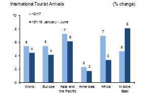 Según el barómetro de dicha entidad, lideran el crecimiento Oriente Medio (+8%) y Asia-Pacífico (+6%). Europa, por su parte, muestra un avance interanual del 4% en los primeros seis meses de 2019, con un primer trimestre positivo seguido de un segundo superior a la media (+8% y +6%, respectivamente). América y África muestran los incrementos más moderados, con tasas del 2% y del 3%.