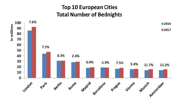 Londres tuvo el mayor número de pernoctaciones en 2017 con un aumento del 7,6%, seguido de París (+7,5%), Berlín (+0,3%) y Roma (+2,4%). Praga (+7,5%), Amsterdam (+11,2%) y Múnich (+11,7%) tuvieron la tasa de crecimiento más alta entre las 10 ciudades principales. Por otro lado, Barcelona se vio muy afectada por el referéndum catalán y bajó al quinto puesto del ranking, mientras que las otras ciudades se mantuvieron en las mismas posiciones de clasificación que el año pasado; y Berlín detuvo su tendencia al alza debido a la declaración de bancarrota de Airberlin en 2017.