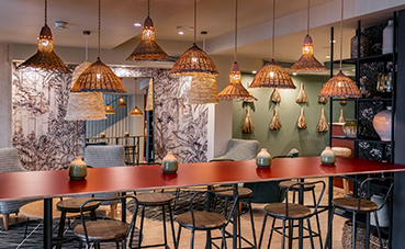 El nuevo diseño, realizado por Carmen Montoro de Triggo Decoración, ha aprovechado la ubicación del establecimiento para trasladar un ambiente tranquilo al interior del hotel. Distintas estancias conviven en la planta baja: recepción, el bar lounge, restaurante y zona de relax. Dichos espacios forman una unidad cromática, gracias a los materiales naturales como las maderas o las fibras, que contrastan con otros elementos diferentes como los espejos.