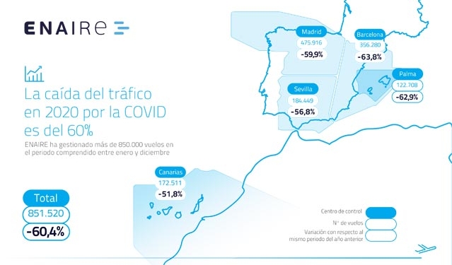Enaire cierra el 2020 con un 60% menos de vuelos