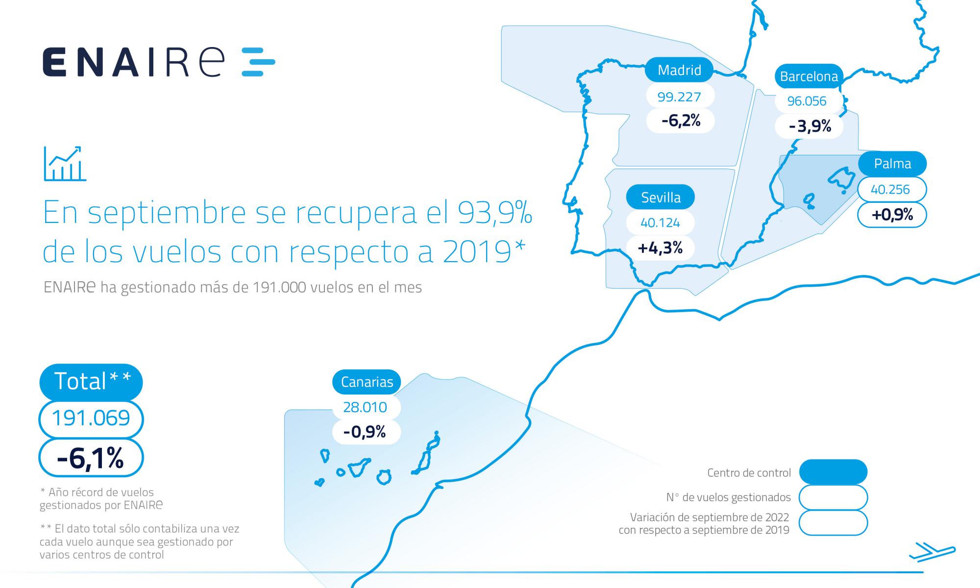 En septiembre de 2022, los vuelos nacionales, 37.918, se recuperaron el 98,9% respecto a 2019; los internacionales, 110.706, el 90,2%, y los sobrevuelos (que no tienen su origen ni destino en un aeropuerto español), 42.445, subieron el 0,2%.