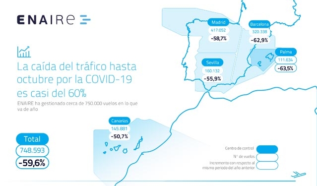 Esta tendencia negativa se siguió observando en octubre, cuando gestionaron 66.622 salidas, un 65,3% menos que el mismo mes del año anterior. Los vuelos internacionales fueron 28.830 (-74,7%); los nacionales, 21.455 (-42,7%) y, los sobrevuelos, 16.337 (-59,9%). Las Comunidades más afectadas en este mes han sido Madrid, Barcelona, Sevilla, Palma y Canarias, todas sufriendo disminuciones superiores al 50%, y siendo la isla balear la principal afectada.
