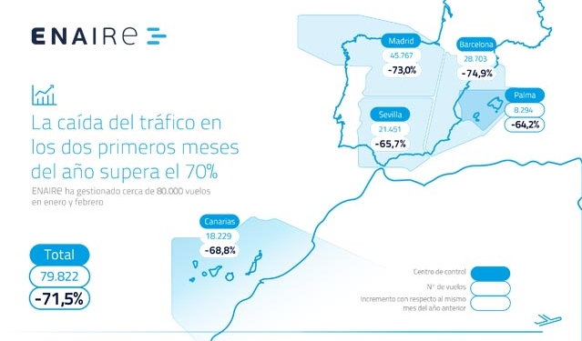 En este sentido, los vuelos nacionales son los que mejor han evolucionado en los dos primeros meses del año, con una caída del 56,4% (27.743). Los internacionales, con 32.263, se reducen el 78,6% y los sobrevuelos (19.816) bajan un 69,7%. El reparto por tipo de vuelos durante en enero y febrero fue 40% internacionales, 35% nacionales y 25% sobrevuelos. Cabe destacar que todos los centros de control de Enaire registran caídas en el tráfico en ese periodo, siendo Palma, Sevilla y Canarias los que registran menores reducciones.