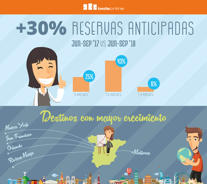 Las reservas anticipadas para el periodo estival —de junio a septiembre—para España como mercado emisor han crecido un 30% respecto al año pasado, según Bedsonline. Las reservas con un año de antelación son las que han experimentado un incremento más significativo, con un aumento del 43% respecto al año anterior. Le siguen las reservas con nueve meses de antelación, con un aumento del 25%.