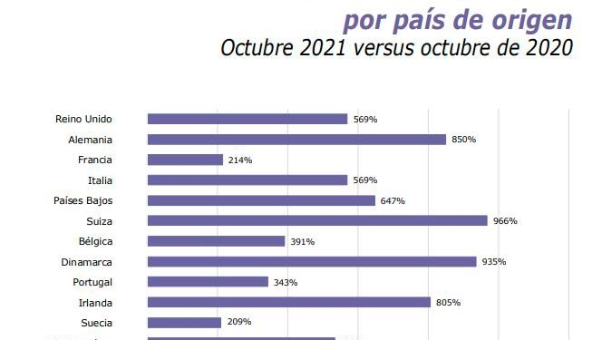 Una de las principales novedades que reflejan los datos de octubre es que Reino Unido se consolida como primer mercado emisor, con 1.107.954 pasajeros (20% del total), seguido de Alemania (18,8% del total), y Francia (8,1%). Igualmente, por primera vez un mercado prioritario para España muestra ya una recuperación total. Los pasajeros procedentes de Dinamarca, 145.818, representan un 2,3% más que los que viajaron en el mismo mes de 2019. Países Bajos, con 399.800 pasajeros, recupera el 98%; Bélgica, con 235.646, está ya al 84%; Suiza, con 247.125, al 83% o Alemania, al 77%.