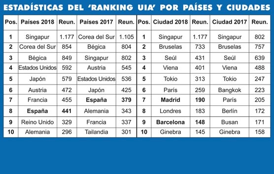 La UIA ha contabilizado un total de 11.240 reuniones internacionales que tuvieron lugar en 2018 —un 4,2% más que en 2017— en 167 países (1.197 ciudades) de todo el mundo. La clasificación la lidera Singapur, con 1.177 eventos, seguido de Corea del Sur (854), Bélgica (849), Estados Unidos (592) y Japón (579). Completan el top ten Austria, con 472 reuniones internacionales, Francia (455), España (441), Reino Unido (329) y Alemania (296).