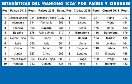 En el ranking de 2019, España ha descendido una posición situándose cuarto respecto al año anterior al acoger un total de 578 reuniones, un 9% menos que en 2018. En primer lugar está Estados Unidos con 934 eventos, seguido de Alemania con 714 y Francia con 595. Tras España completan el top ten internacional Reino Unido con 567, Italia con 550, China con 539, Japón con 527, Países Bajos con 356 y Portugal con 342.