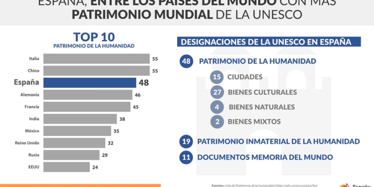 Además de la lista de Patrimonio Cultural Inmaterial, España esta en los primeros puestos en la lista de Patrimonio Mundial, que destaca bienes y lugares que, por su valor universal excepcional, pertenecen no solo a su país sino al legado común de la Humanidad. España, con 48 bienes y sitios catalogados, está entre los tres países del mundo con más designaciones de este tipo UNESCO, solo superado por China e Italia.