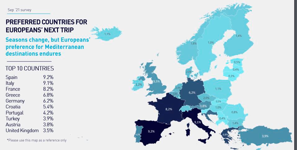 Las escapadas intraeuropeas están ahora entre las prioridades de los europeos, lo que indica un mayor interés en viajar más allá de su país. Así, más del 50% de los turistas con expectativas de viaje a corto plazo, se dirigirá a otros destinos europeos, lo que supone un aumento del 41% desde septiembre de 2020. Mientras tanto, las preferencias por los viajes nacionales (32%) disminuyeron un 18% en los últimos doce meses. Los destinos mediterráneos ocupan el primer lugar en la lista de deseos de los viajeros, con España e Italia (ambos con un 9%), Francia (8%) y Grecia (7%) como principales preferencias.