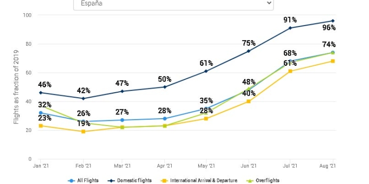 En términos más concretos, los vuelos nacionales mostraron un comportamiento mucho más positivo, situándose en el 96% en agosto, en comparación con la etapa prepandémica, y en un 91% en el mes de julio. En el ámbito internacional, no se alcanzan dichos resultados, pero nuestro país ha operado por encima del 60% de los vuelos del 2019 (68% en agosto y 61% en julio). Por su parte, los sobrevuelos muestra resultados cercanos e incluso superiores al 70%, si lo comparamos con los mismos meses preCovid-19.