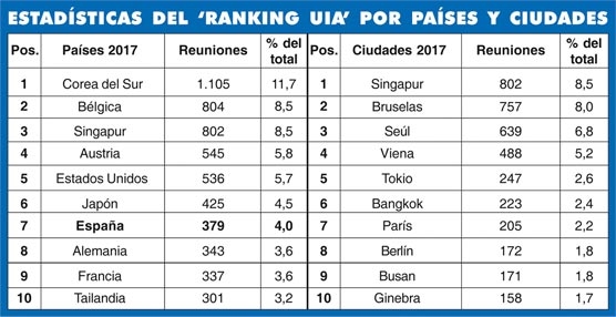 España ha caído una posición respecto al ranking de la UIA de 2016, con 379 eventos, cuando el año anterior acogió 423 reuniones. Respecto a las ciudades, la clasificación está encabezada por Singapur, Bruselas y Seúl, y sorprende que entre las 10 primeras no haya ningún destino español. En 2016 solo Barcelona entraba en el top ten de UIA con 182 actos.