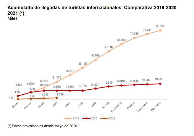En el acumulado de los cuatro primeros meses de 2021 el número de turistas que visitan España disminuye un 82,6%
