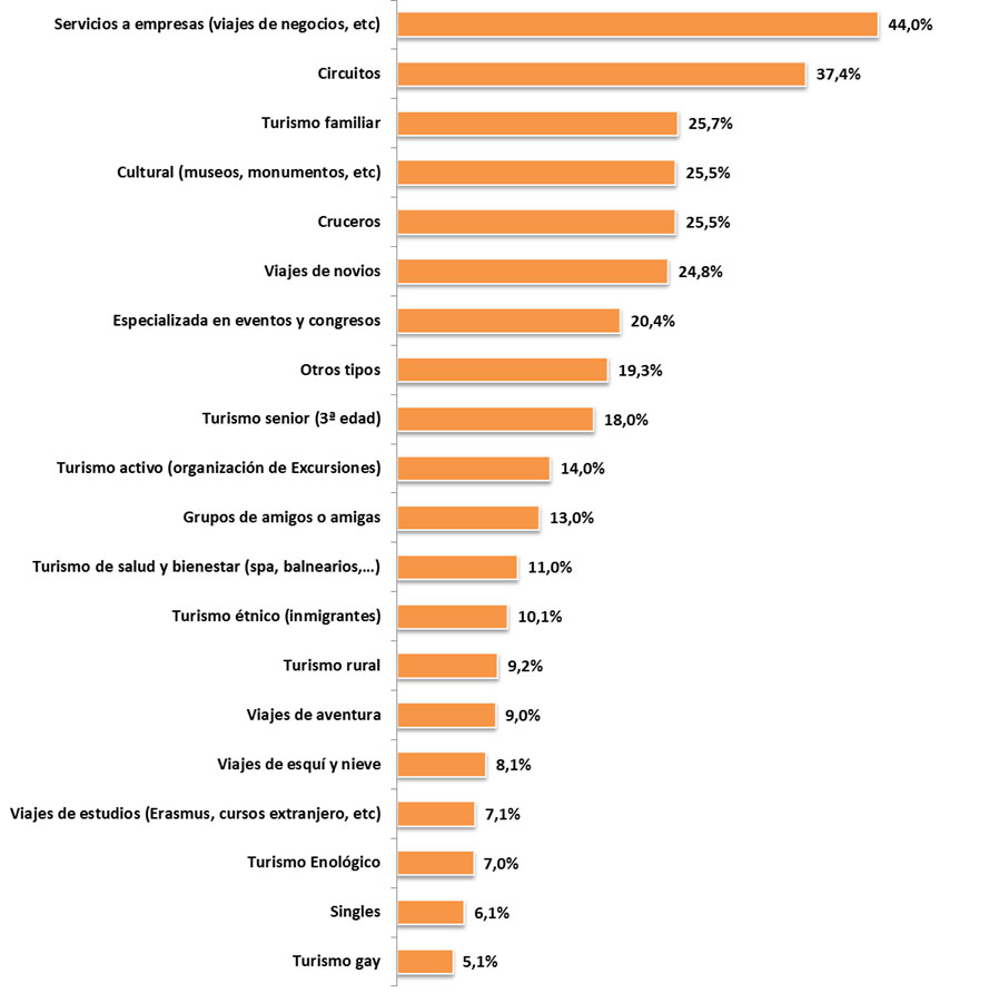 De ellas, la especialización predominante son los productos relacionados con el segmento business (el 44% declara especialización genérica en este segmento, junto con un 20,4% dedicadas a eventos y congresos). En el segmento vacacional, las opciones más señaladas son los circuitos, los cruceros, el Turismo familiar, el Turismo cultural y los viajes de novios, segmentos mencionados por el 37,4%, 25,5%, 25,7%, 25,5% y 24,8%, respectivamente.