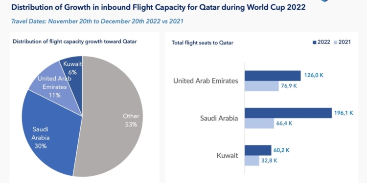Con estos datos, apuntan que el impacto en la conectividad aérea será proporcionalmente mucho mayor para otros países en el Medio Oriente. Kuwait verá aumentada su capacidad de vuelo en un 53%, mientras que Emiratos Árabes Unidos y Arabia Saudita verán un aumento del 46% y 43% respectivamente durante este período. “Como resultado de esto, 14,6 millones de asientos aéreos entrantes están programados para esta región durante el tiempo del evento”, destacan.
